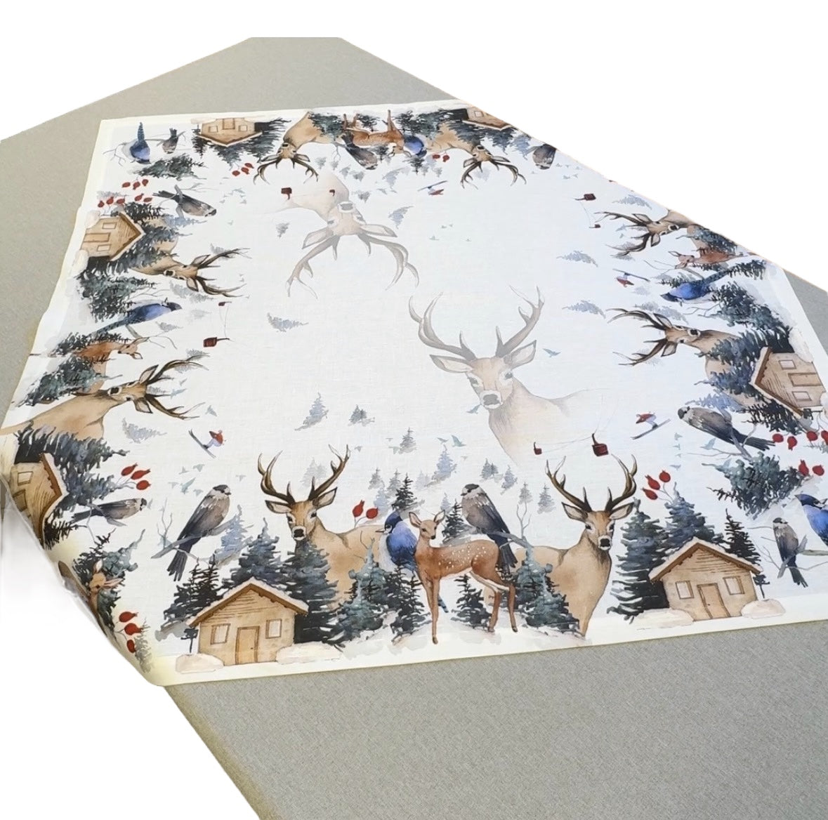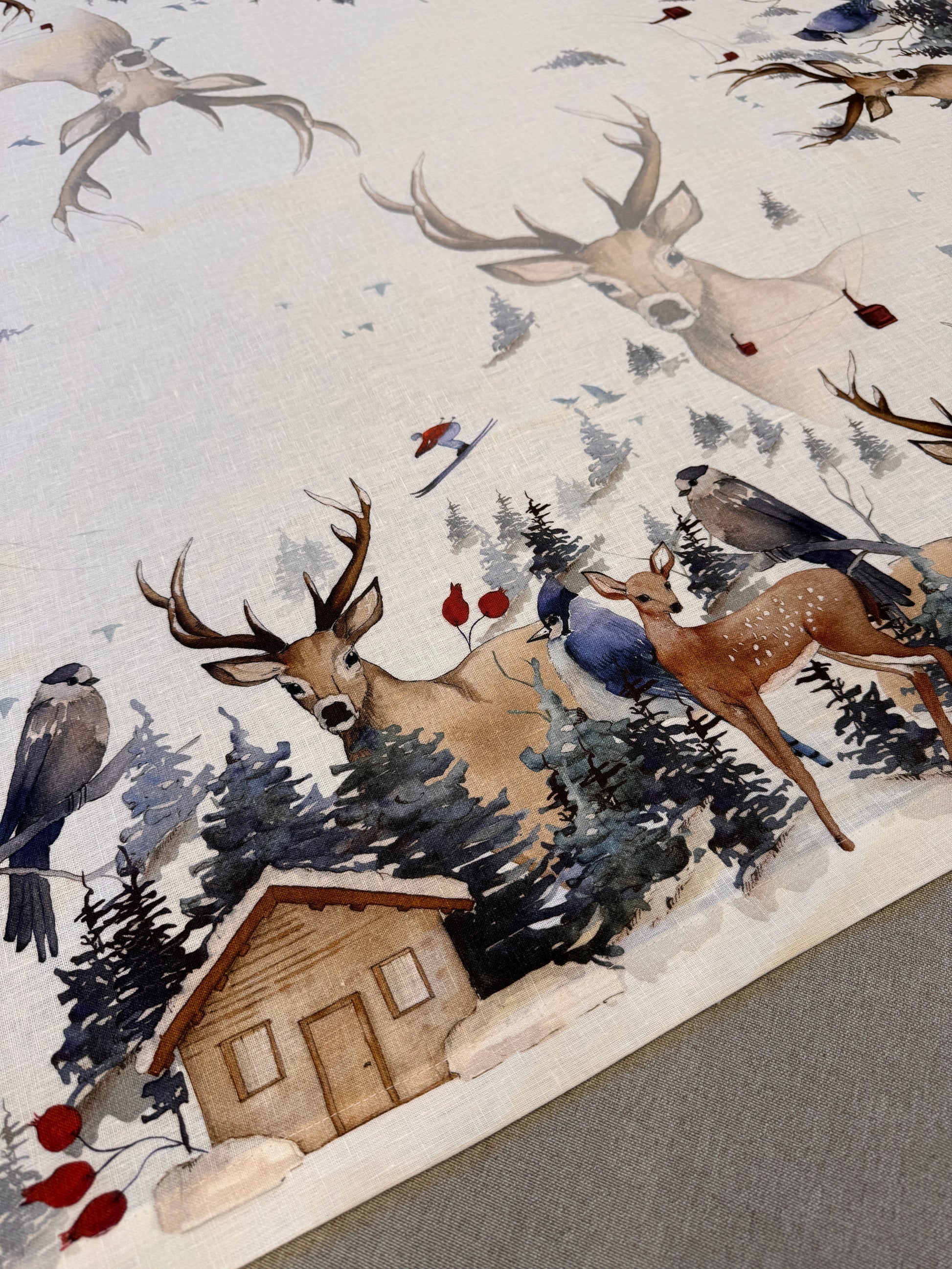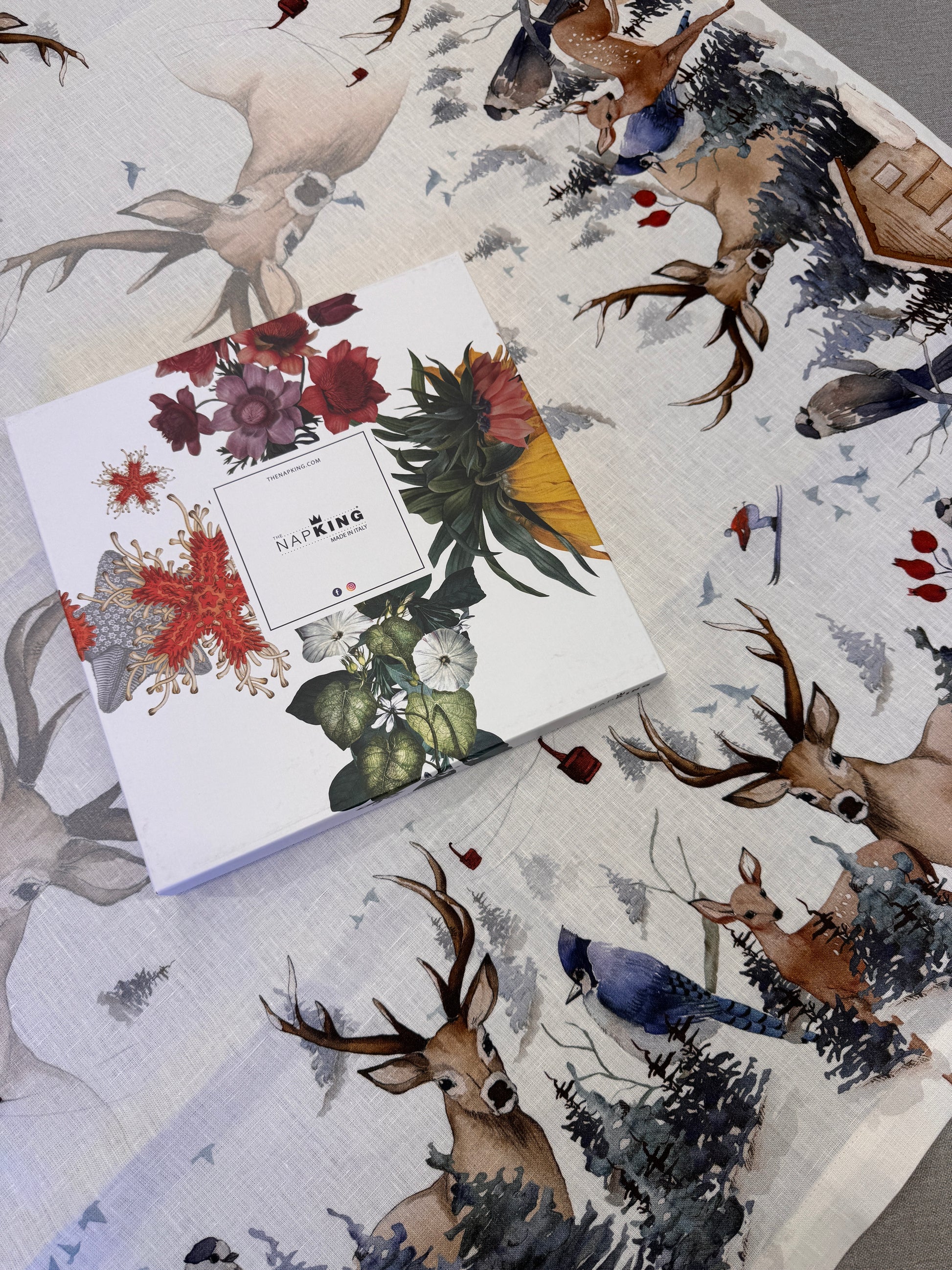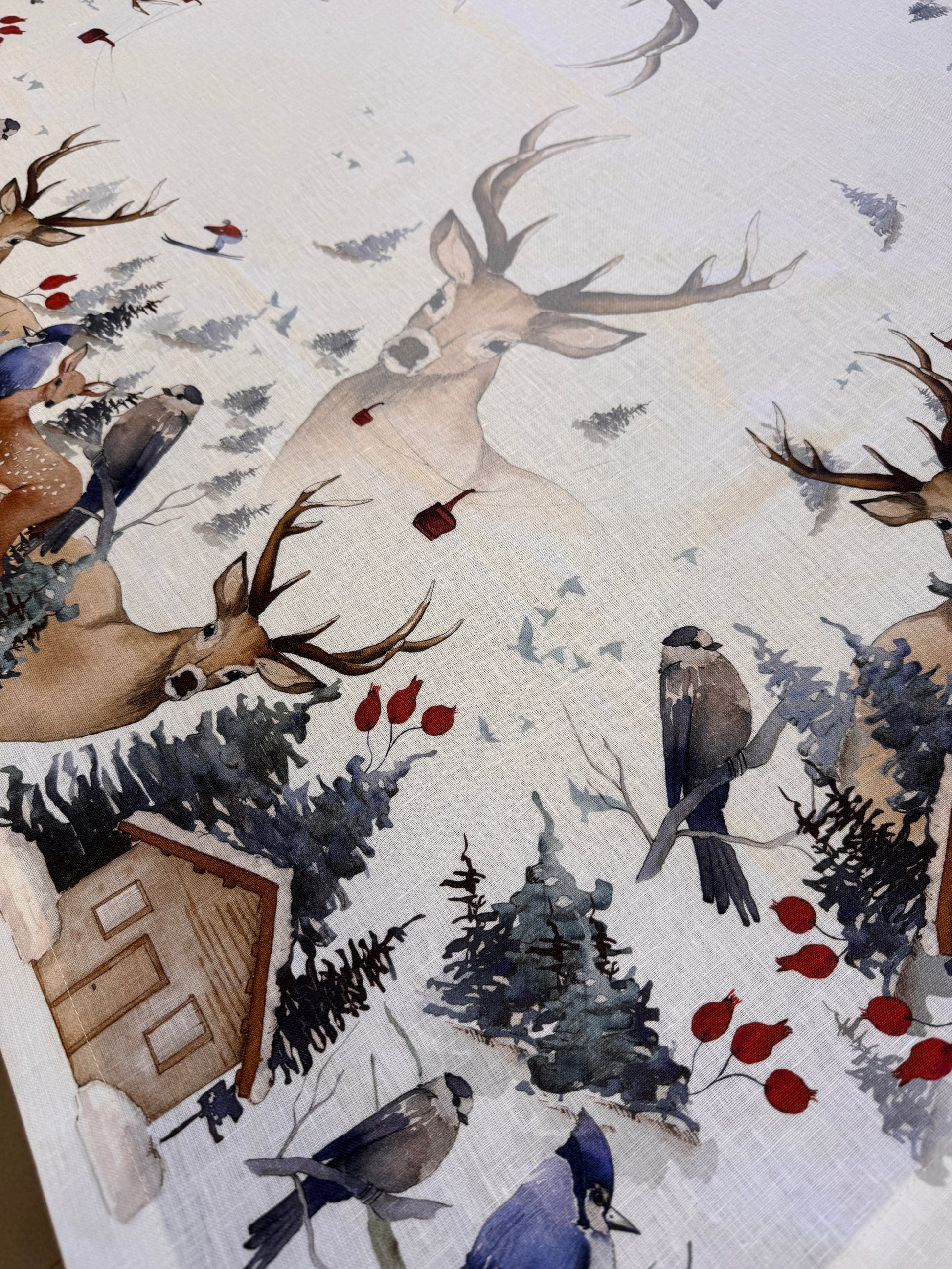 Porta in tavola l’atmosfera accogliente dell’inverno con la nostra tovaglia in 100% lino, decorata con motivi invernali ispirati ai colori e alle forme della stagione.