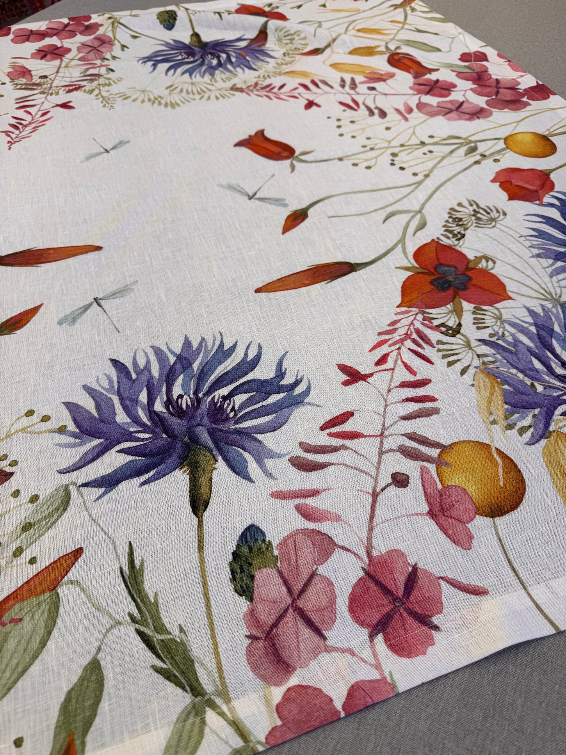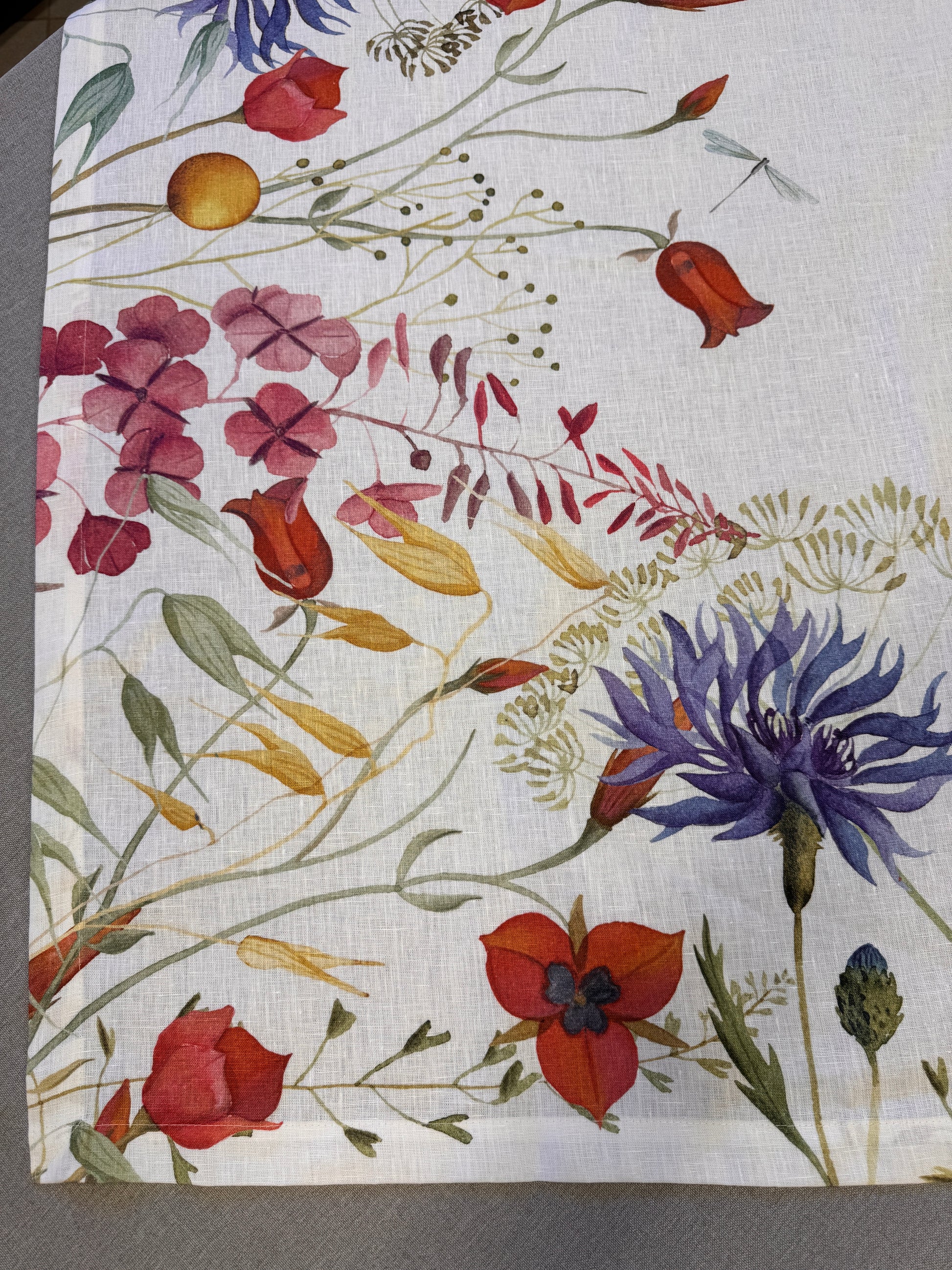 Il lino naturale, morbido e resistente, esalta la bellezza del disegno floreale e conferisce alla tavola un aspetto curato e accogliente.